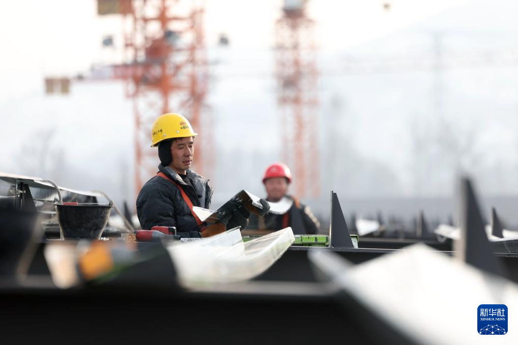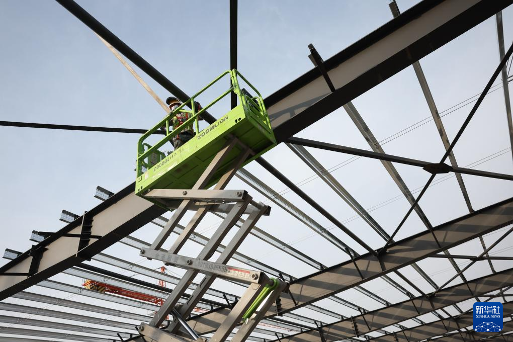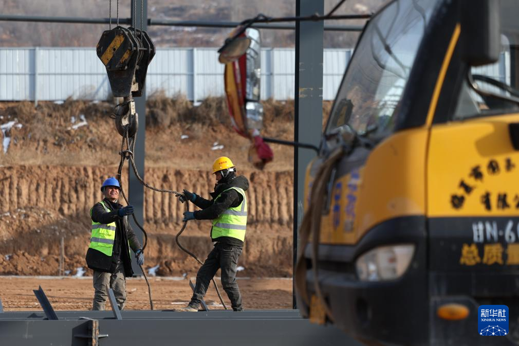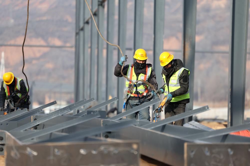 施工人员在中铁二十局承建的甘肃临夏综合物流园项目建设现场进行钢结构安装作业(1月6日摄)。新华社记者 陈斌 摄
