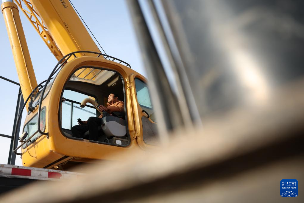 一位吊车司机在中铁二十局承建的甘肃临夏综合物流园项目建设现场进行起吊作业(1月6日摄)。新华社记者 陈斌 摄