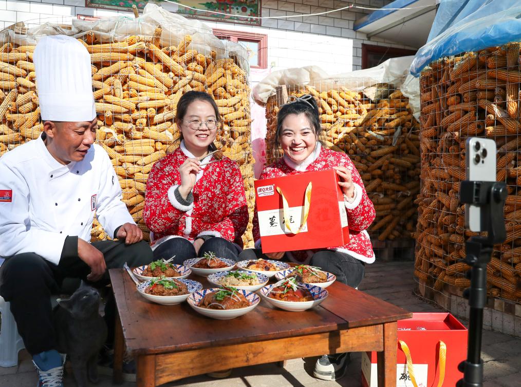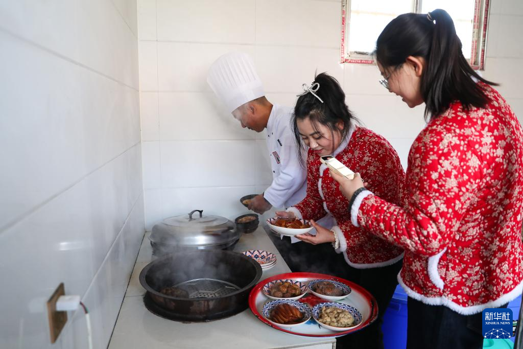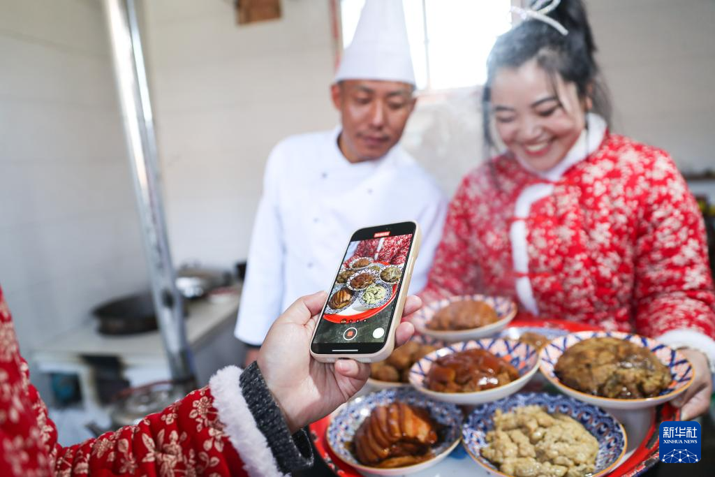 1月5日,“唐Q大队”助农工作室主播在庆阳市合水县西华池镇唐旗村村民家里拍摄刚出锅的蒸碗。新华社记者 郎兵兵 摄