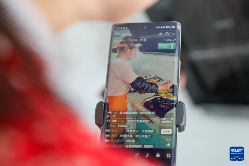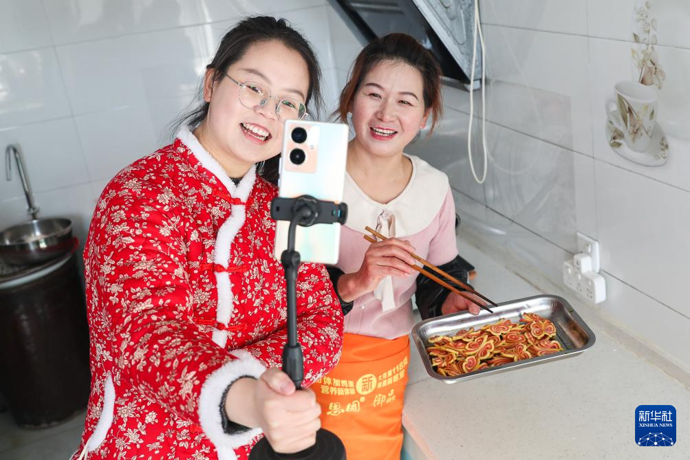 1月5日,“唐Q大队”助农工作室主播在庆阳市合水县西华池镇唐旗村村民家里直播特色小吃“炸油果果”的制作过程。新华社记者 郎兵兵 摄