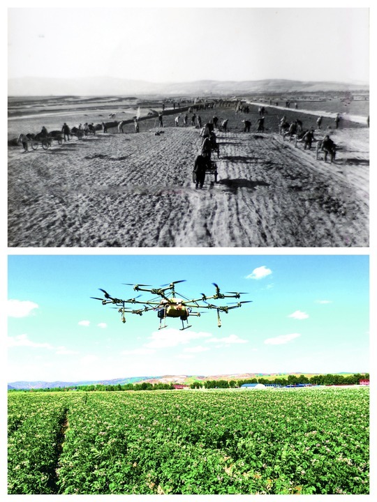 拼版照片:上图为上世纪90年代定西市安定区群众种植马铃薯场景。下图为2024年定西市安定区香泉镇马铃薯种植基地进行无人机田间管理作业。(定西市委宣传部供图)