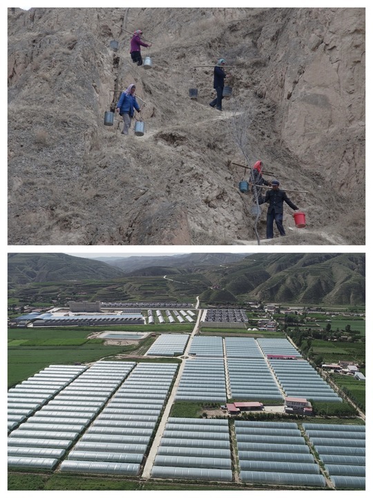 拼版照片:上图为上世纪90年代定西市安定区山区群众挑水的场景,下图为引洮工程通水后有了水源保障的蔬菜大棚。(定西市委宣传部供图)