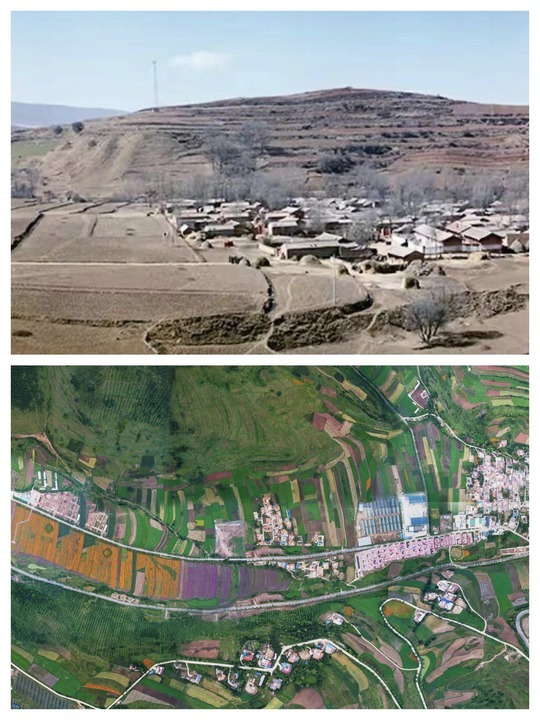 拼版照片:上图为2013年拍摄的定西市渭源县元古堆村旧貌。下图为2022年拍摄的定西市渭源县元古堆村新貌。(定西市委宣传部供图)