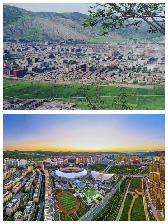 拼版照片:上图为20世纪90年代的定西,下图为现在的定西。(定西市委宣传部供图)
