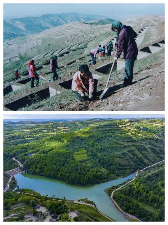 拼版照片:上图为上世纪90年代定西市干部群众进行荒山植树造林,下图为定西市通渭县植绿后生机勃勃的陇山镇康家屲。(定西市委宣传部供图)