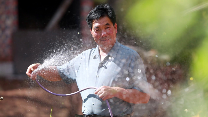 定西市渭源县上湾镇常坪村村民胡建斌在家门口用自来水浇花。新华每日电讯记者郭刚摄
