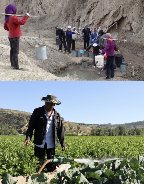 拼版照片:上图为上世纪90年代拍摄的定西市通渭县山区群众在山泉前排队取水饮用。下图为2022年8月定西市安定区引洮供水工程受益区村民进行菜地灌水。(定西市委宣传部供图)