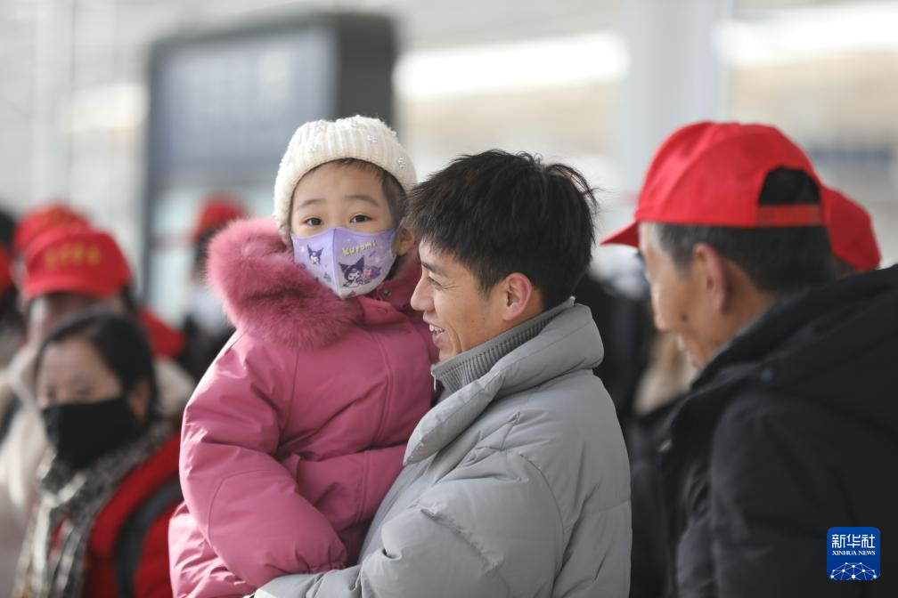 2月7日,甘肃省定西市外出务工人员抱着孩子在站台上等候。新华社记者 张睿 摄