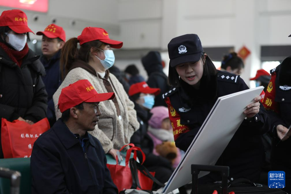 2月7日,兰州铁路公安处乘警在候车室为外出务工人员讲解出行注意事项。新华社记者 张睿 摄
