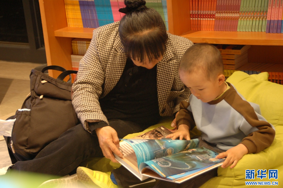 西北书城内,市民带领小朋友翻看绘本。新华网发(张嘉悦 摄)