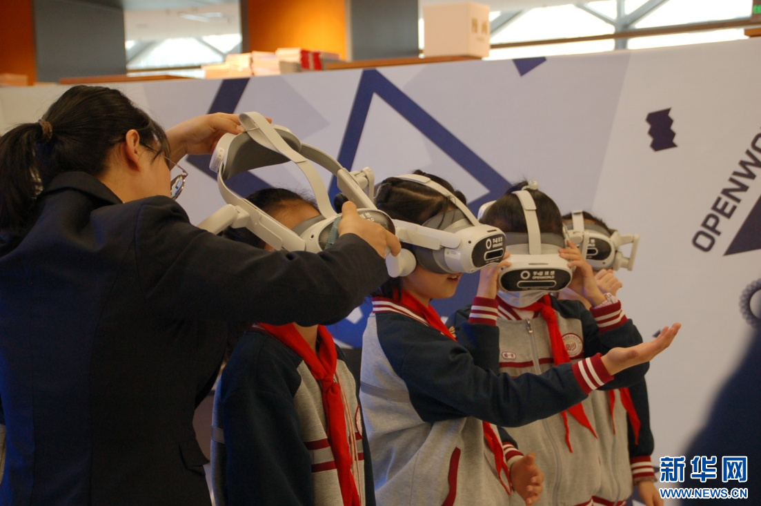 学生们在“西北书城·书界奇境LBE沉浸式空间剧场”体验VR场景。新华网发(张嘉悦 摄)