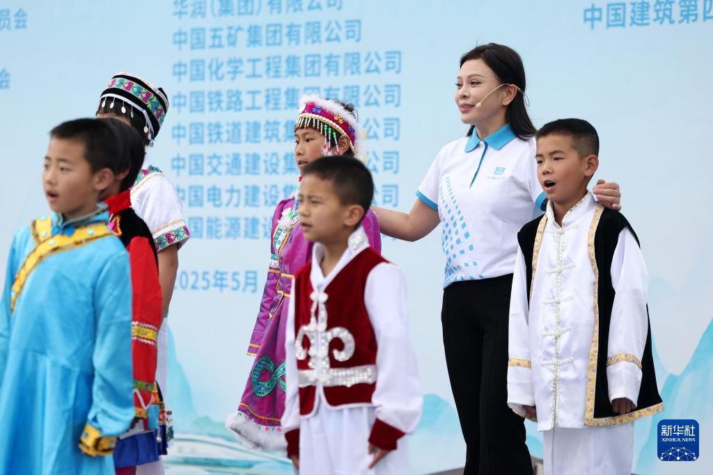 5月21日,中建集团志愿者与康乐县八松乡龚庄小学的孩子在活动现场表演节目。新华社记者 陈斌 摄