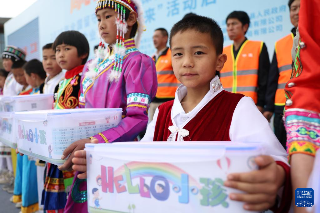 5月21日,康乐县八松乡龚庄小学的孩子在活动现场收到爱心礼物。新华社记者 陈斌 摄