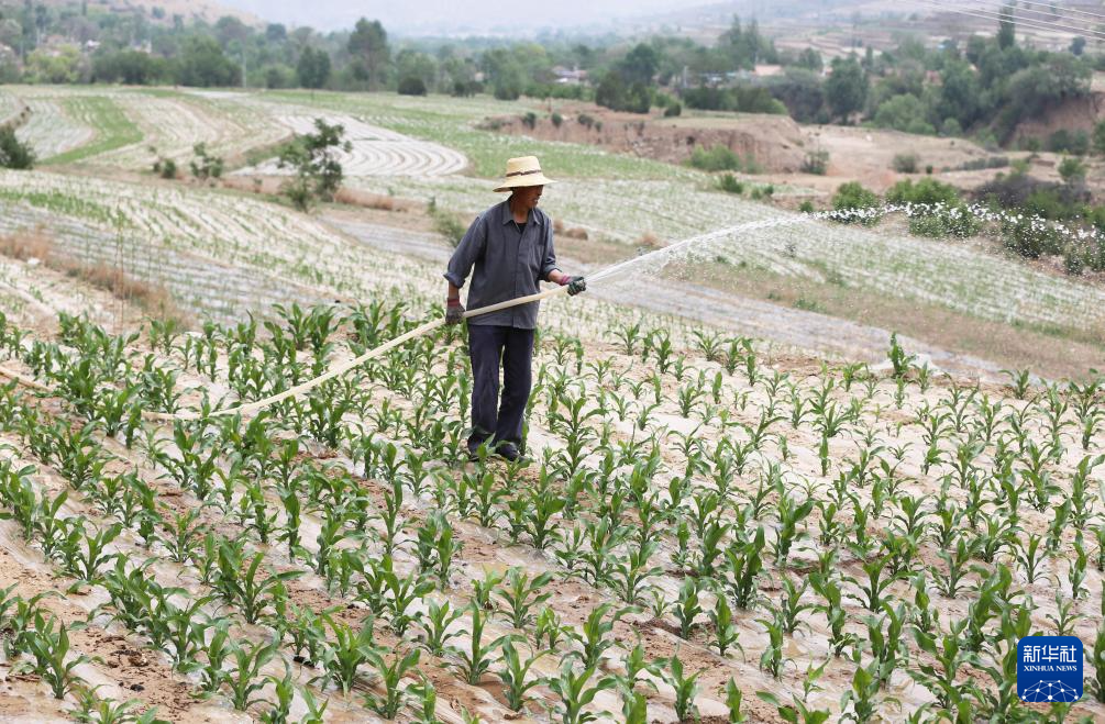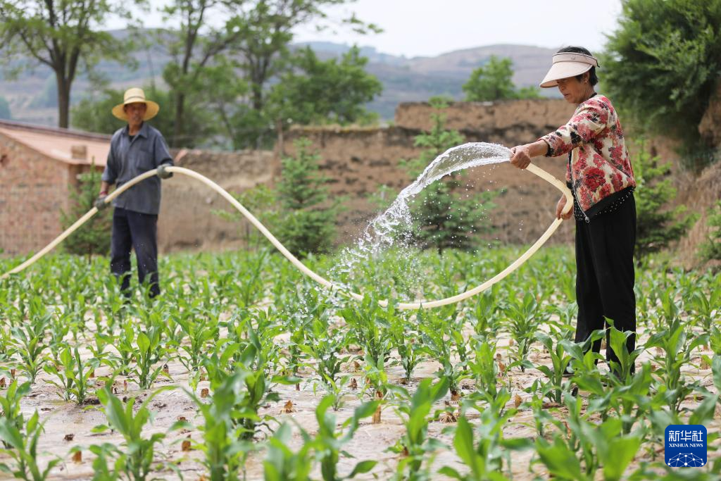5月21日,在甘肃省定西市通渭县寺子川乡,农民给玉米地浇水。新华社发(王克贤 摄)