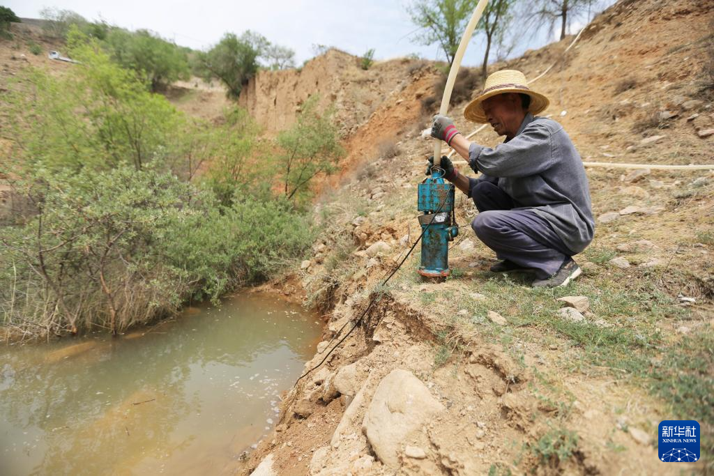5月21日,在甘肃省定西市通渭县寺子川乡,农民检查水泵准备抽水浇地。新华社发(王克贤 摄)