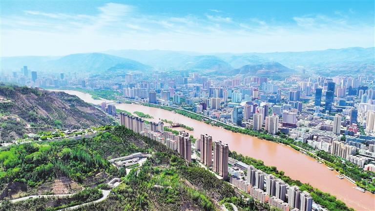 蓝天白云下的兰州黄河两岸郁郁葱葱-新华网