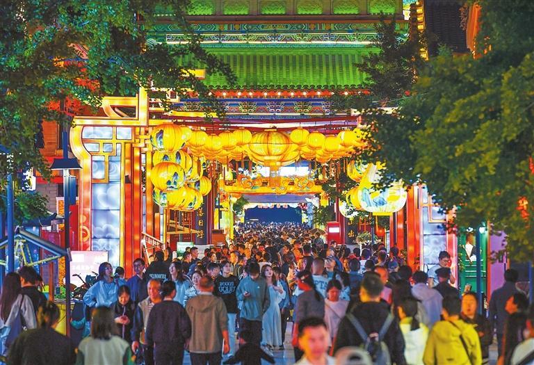 中山桥北的金城关景区华灯璀璨,丰富的文化活动吸引了大量游客前来。古色古香的建筑与精彩纷呈的民俗表演相得益彰,传统手工艺品、文创产品等琳琅满目,游客们在这里观赏游玩。