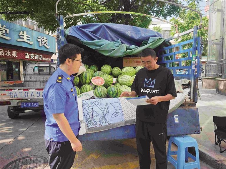 在城关区畅家巷杏苑小区门口,城管执法队员正在为瓜农们发放兰州市应季自产自销瓜果临时摊点证。来自皋兰县什川镇的瓜农魏德伟接过证件后,第一时间将其悬挂在摊位醒目位置。“今早7时就到了,先把摊位周边打扫干净,得自觉维护好城市环境。”他笑着介绍,家中种植了十余亩西瓜,有了这张“合法经营通行证”,今年的销售更有保障了。