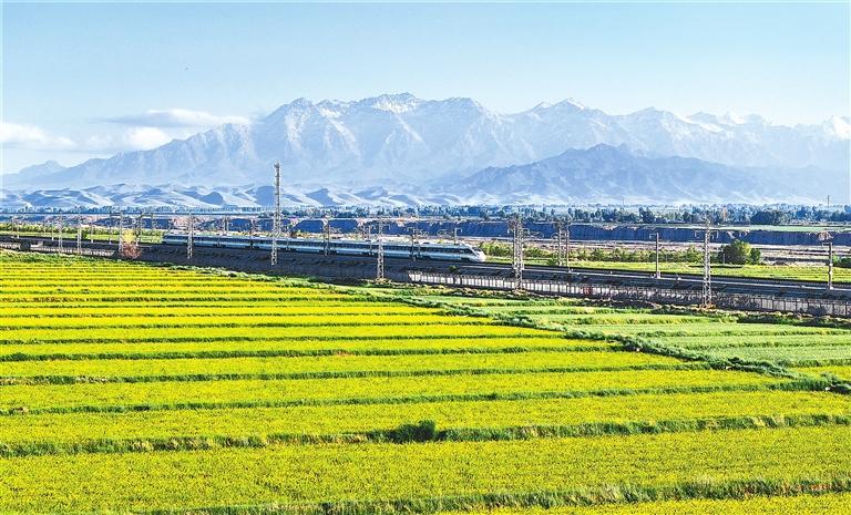 近日,民乐县三堡镇徐寨村的油菜花竞相绽放,与行驶的列车交相辉映,构成一幅美丽的田园画卷。新甘肃·甘肃日报通讯员 王晓泾