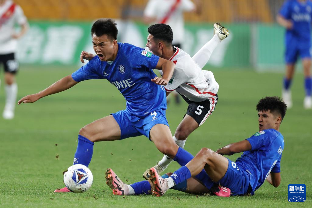 6月28日,无锡吴钩队球员梁金虎(左)和兰州陇原竞技队球员吾麦尔·阿布都克力木(中)拼抢。新华社记者 陈斌 摄
