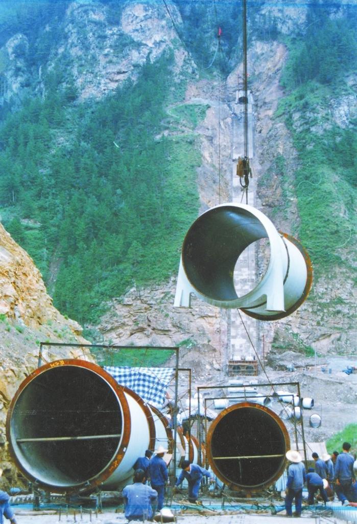这是在引大入秦工程总干渠建设过程中,先明峡倒虹吸钢管吊装作业时的场景。(资料图)