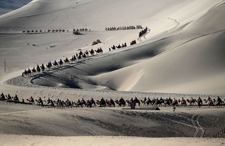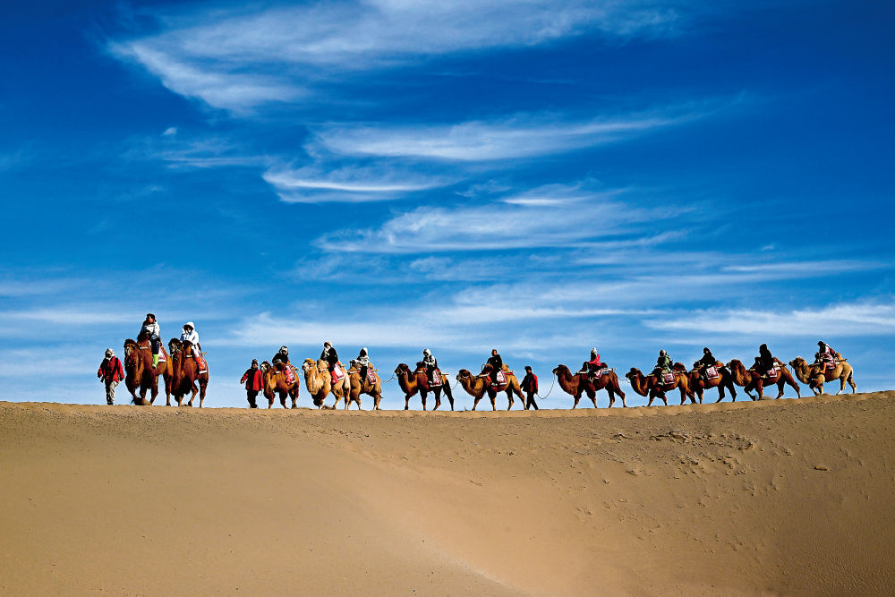 游客骑骆驼在甘肃省敦煌市鸣沙山月牙泉景区游览。张晓亮 摄