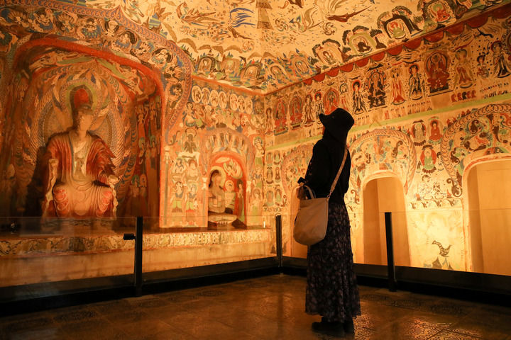 在敦煌石窟文物保护研究陈列中心,游客参观莫高窟复制洞窟第285窟壁画和造像。新华社记者 郎兵兵 摄