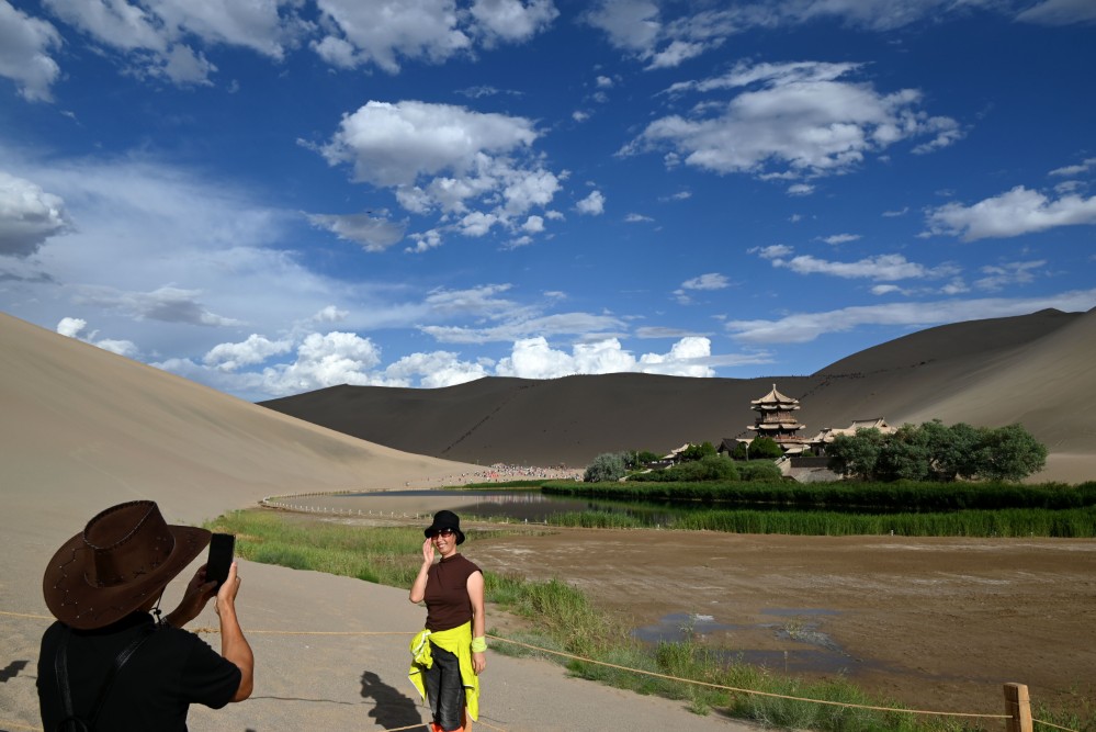 游客在甘肃省敦煌市鸣沙山月牙泉景区游览拍照(6月21日摄)。新华社发(张晓亮 摄)