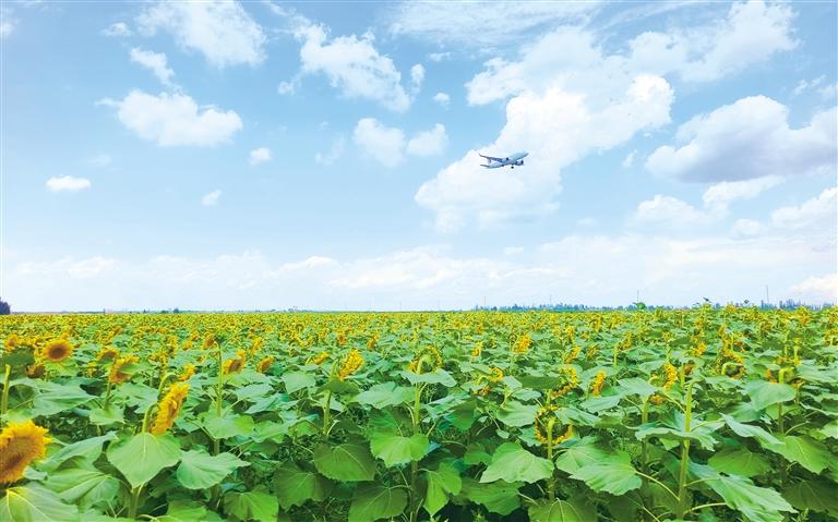 在向日葵花海中,甘肃美佳乐农业有限公司负责人薛正贤介绍:“新区充足的阳光与显著的昼夜温差,正滋养着进入授粉期的葵花,预计亩产将达600斤。”这片盛放至九月中旬的金色海洋,不仅成为游客竞相打卡的热土,更持续带动着周边观光旅游产业,实现了生态颜值与经济价值的双丰收。