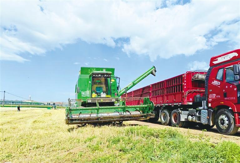 与此同时,小麦收割正在中川镇高效推进。大型收割机在麦浪中穿梭作业,饱满的麦粒如瀑布般倾泻而下,农民脸上洋溢着丰收的喜悦。甘肃亚盛实业与圣美达农业的示范田里,科技力量的加入让丰收更有底气——无人机飞防作业效率远超人工十倍,“一喷三防”精准到位,科学施肥方案护航全程。全面机械化收割更显著提升了效率,亩产预计突破500公斤。“科学管理实现了产量与品质的双保障。”甘肃亚盛实业负责人陈爱年欣喜地表示。