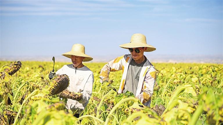 金秋时节,兰州新区西岔镇向日葵种植基地,连绵不绝的金色花海已褪去盛装,结出累累硕果;工人们穿梭田间,有序进行采收、插盘作业,呈现出一派繁忙的丰收画卷。