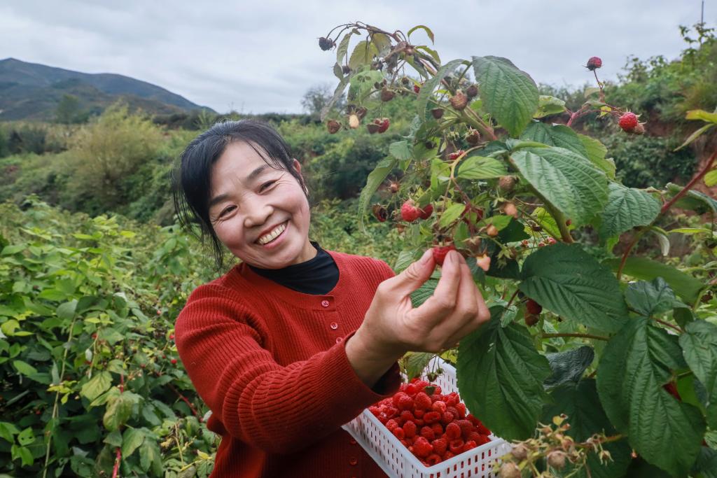 10月6日,种植户在田间采摘红树莓。新华社记者 郎兵兵 摄
