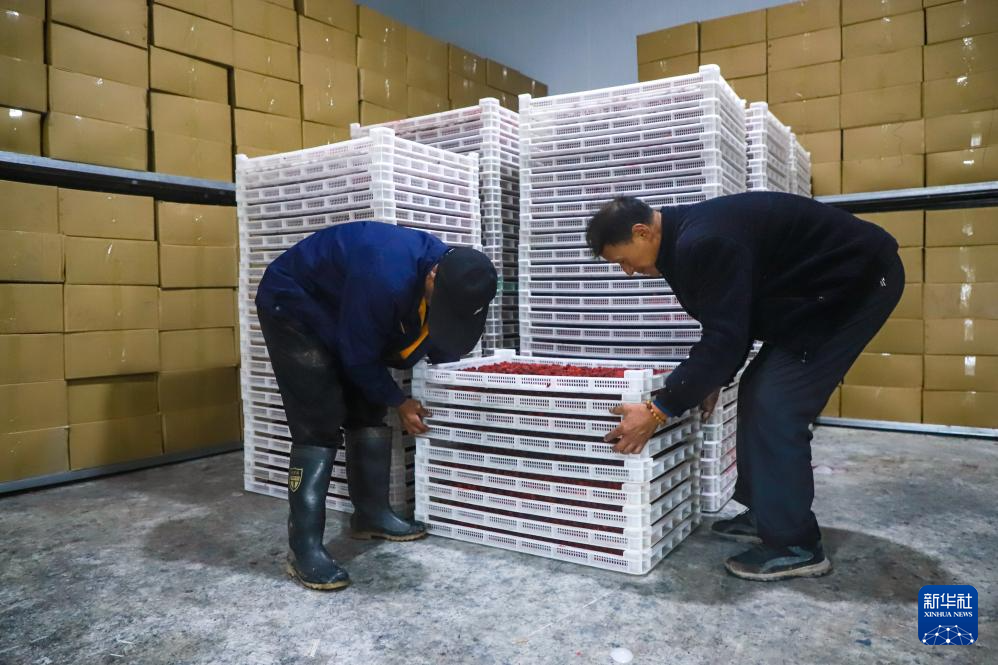 10月6日,在陇南市宕昌县南阳镇一处冷库内,种植户将红树莓码放整齐冷藏锁鲜。新华社记者 郎兵兵 摄