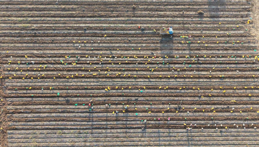 永宁镇秦洼村马铃薯种植田的丰收场景(航拍图)。 董春辉 摄