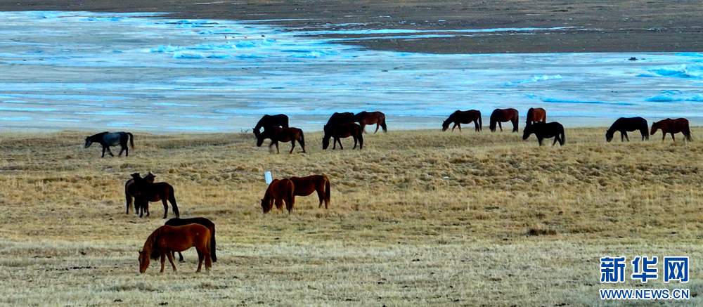 冬日里,在祁连山北麓的山丹马场,成群的骏马在金色的草原上安静觅食,犹如一幅美丽画卷。新华网发(王将 摄)