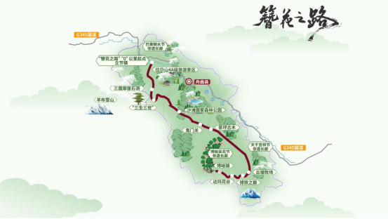 “簪花之路”黄金旅游线位于舟曲县境内,全长137公里,北接扎尕那,南连九寨沟,是连接甘川两省的重要旅游风景线。路线以立节镇为起点,途经拉尕山4A级旅游景区、沙滩国家森林公园、达玛花谷等众多自然与人文景点,串联21个古村落、3条非遗廊道和8处生态秘境,最高点翻越海拔3456米的博铁梁,最终抵达博峪镇吉也诺村。