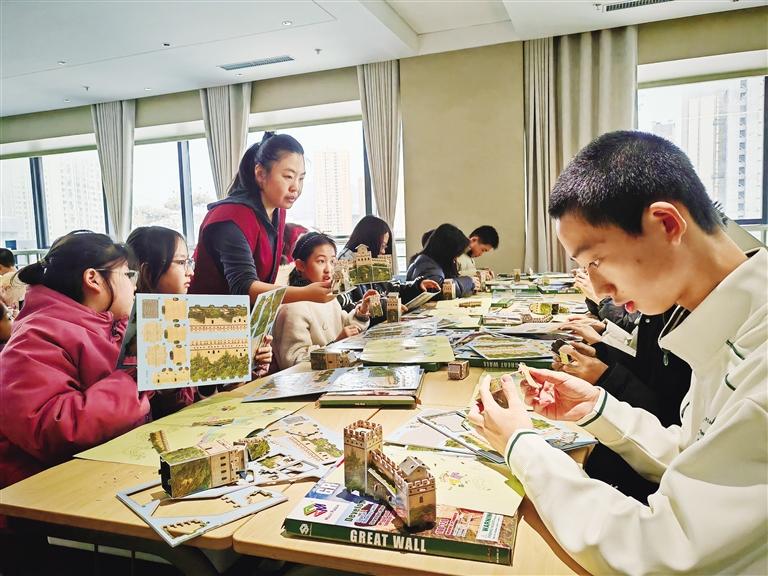 动手实践环节中,志愿者为每位学员分发了立体长城拼图,社教老师逐一指导拼接技巧。孩子们专注地比对零件、拼接城墙,指尖翻飞间,连绵的城墙、矗立的烽火台逐渐成型。