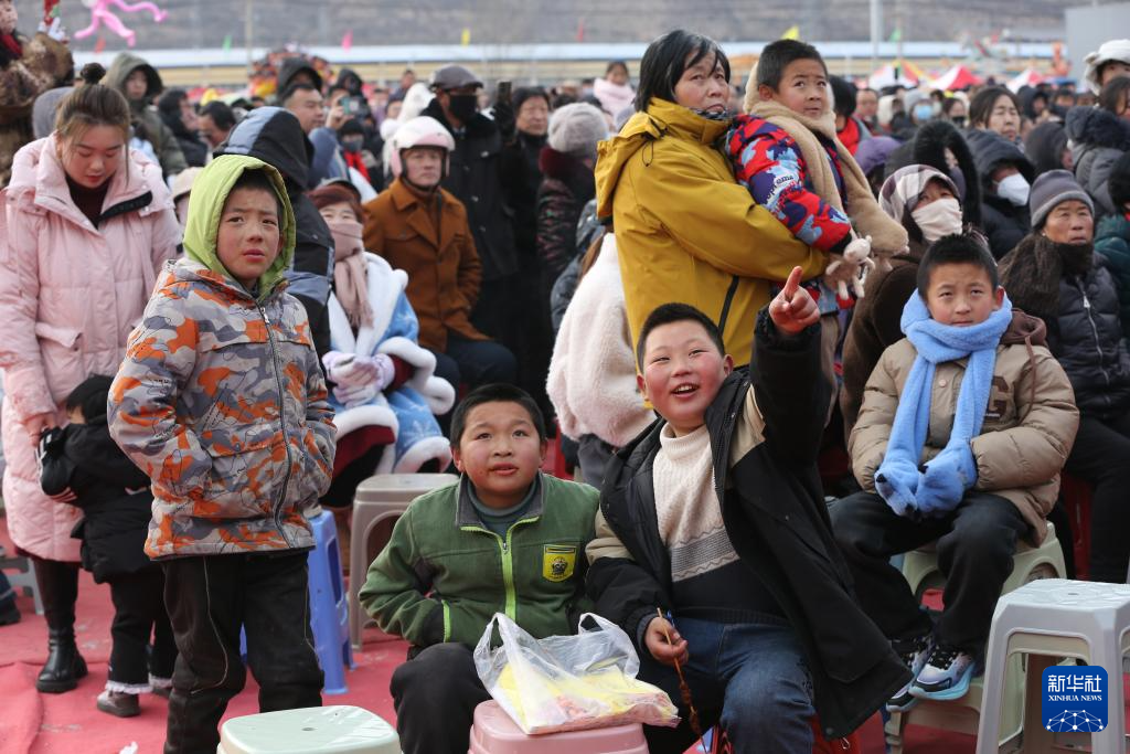 几位小朋友在年货大集上观看秦腔非遗演出(1月19日摄)。新华社发(王克贤 摄)