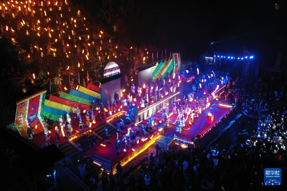 这是3月3日在甘肃省陇南市文县铁楼藏族乡草河坝村拍摄的《吉祥的火把》主题演绎现场(无人机照片)。 新华社记者 范培珅 摄