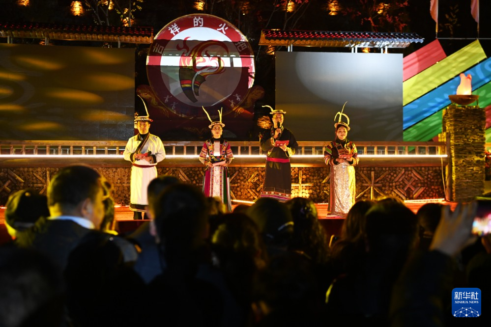 3月3日,在甘肃省陇南市文县铁楼藏族乡草河坝村,当地群众主持《吉祥的火把》主题演绎。新华社记者 范培珅 摄