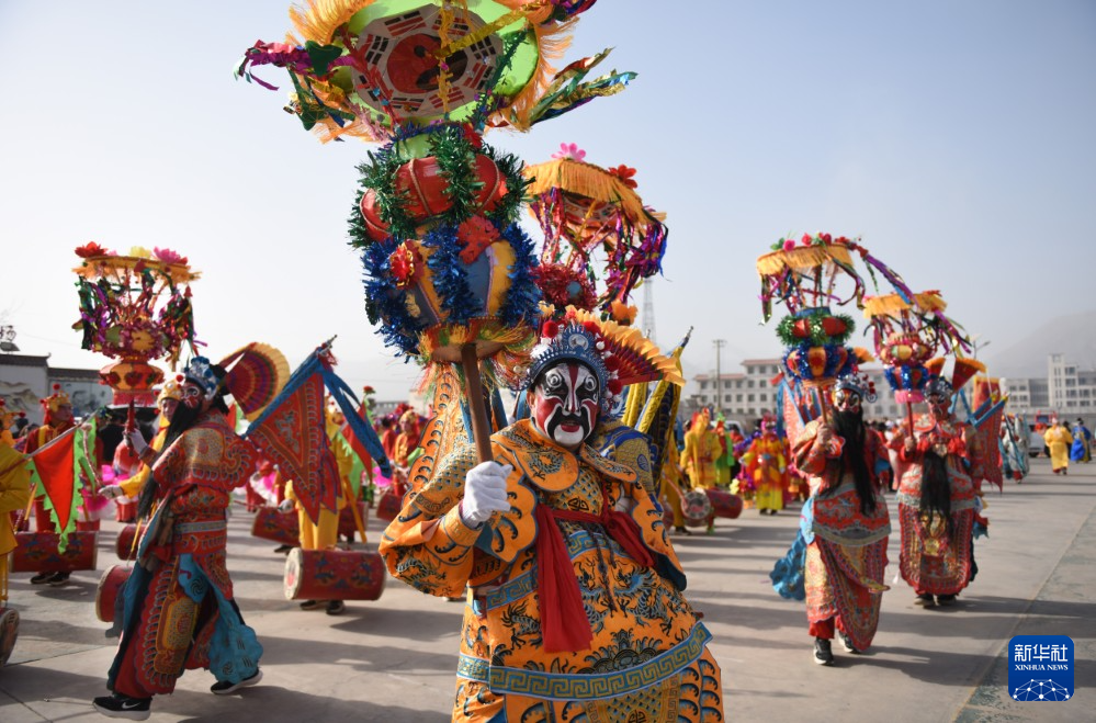 3月3日,社火队员在甘肃省临夏回族自治州永靖县太极镇大川村表演。 新华社发(史有东 摄)
