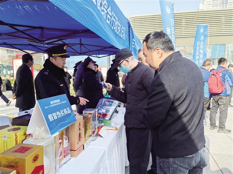 图为在东方红广场,工作人员现场向市民讲解如何辨别假冒伪劣商品。记者 魏佳贝 摄