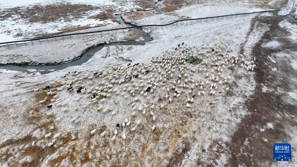 3月18日,在甘肃省阿克塞哈萨克族自治县阿勒腾乡哈尔腾村,羊群在哈尔腾河周边觅食(无人机照片)。新华社发(高宏善摄)