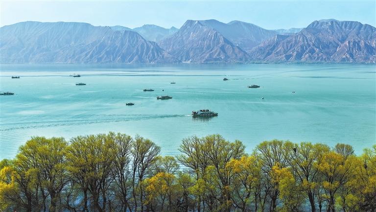 刘家峡水库临夏县莲花镇黄河岸边绿意盎然,吸引游客赏景游玩。新甘肃·甘肃日报通讯员 史有东